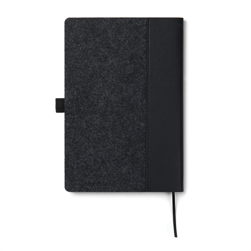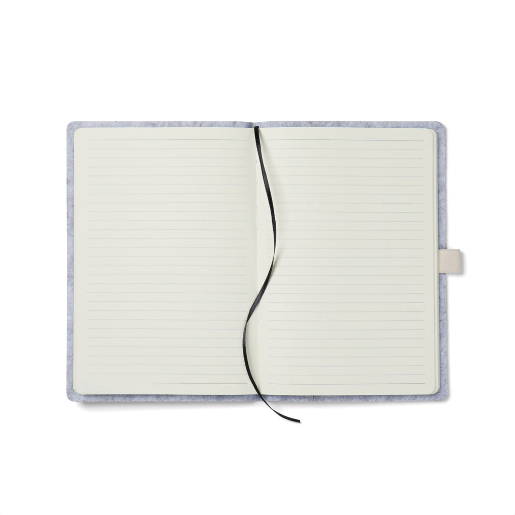Kierrätyshuovasta tyylikkäästi valmistettu A5-muistikirja, jossa on meleerattu ilme ja integroitu kynäpidike. Se sisältää 80 arkkia tai 160 sivua 70 g/m² kierrätyspaperia, ja sen viivoitetut sivut sopivat erinomaisesti kaikenlaisiin muistiinpanoihin. GRS (Global Recycled Standard) -sertifiointi takaa, että kierrätysmateriaalien koko toimitusketju on sertifioitu. Kierrätysmateriaalin kokonaismäärä perustuu tuotteen kokonaispainoon. 83 % tästä tuotteesta on GRS-sertifioitua kierrätyspaperia ja 7 % GRS-sertifioitua kierrätyshuopaa.